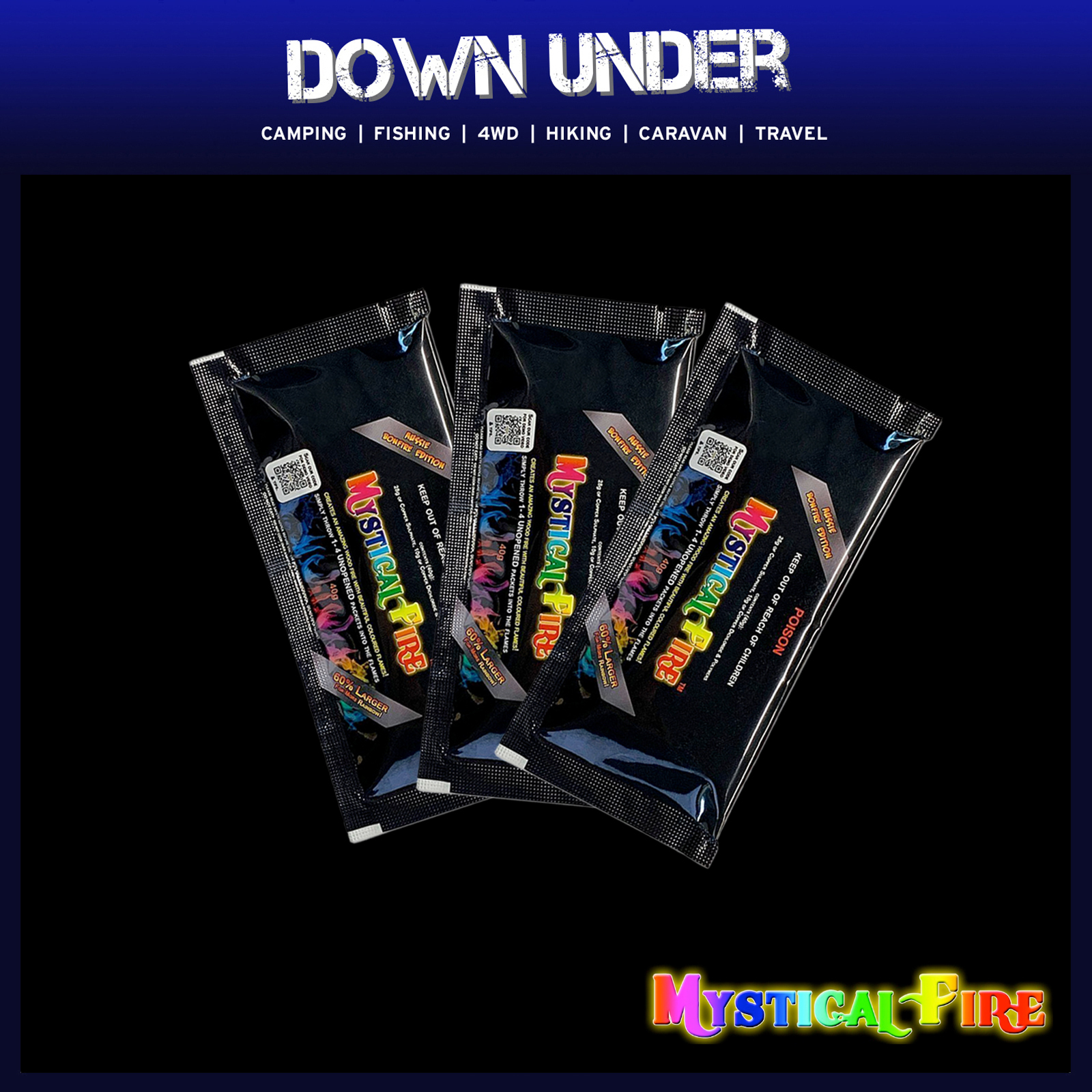 3 x Mystical Fire Bonfire 40g Packs The ever-popular Mystical Fire returns with an expanded packet, increasing the burn-time! The Mystical Fire Aussie Bonfire Edition comes in a package 60% larger than the standard 25g packet. Each package includes 40g of Aussie Bonfire goodness. Impress your mates with a multi-coloured flame that's sure to dazzle. The colourful flames of this campfire novelty turn from red to blue to green to violet and can provide hours of entertainment for the whole family. How it works: It’s very simple to use Mystical Fire. Simply, toss 1-3 packs into any wood burning fire. Then sit back and enjoy the new vibrant colours that Mystical Fire will produce. For best results, use 3 packs at once. Add more packs as you notice the colourful flames disappearing. 3 packs should last about 60-120 minutes, dependent on fire conditions.