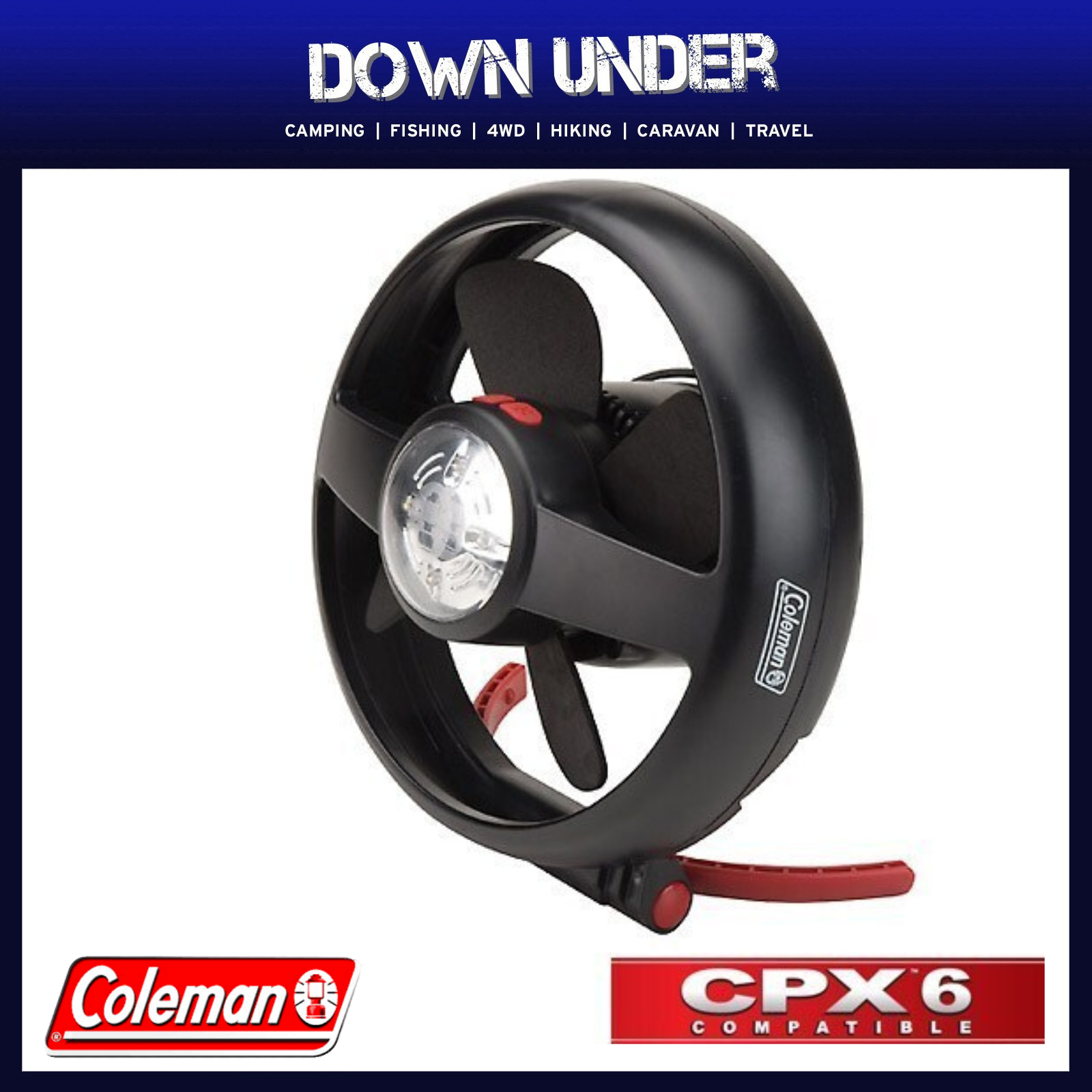 CPX™ system means you can operate on included battery cartridge and 4D batteries, or the rechargeable power cartridge (sold separately) Lighted tent stand with interchangeable power supply Can be used overhead in a tent (magnet included), on the ground or on a table Bright LED lighting is cool to the touch Night light setting included for soft nighttime light Fan diameter is 9.5 in. (24.13 cm), fan blade diameter is 7.5 in. (19.05 cm) Flexible power options Can run on 4 D batteries Can also operate on Coleman® CPX™ 6 rechargeable power cartridge Fan has six blades Made in China