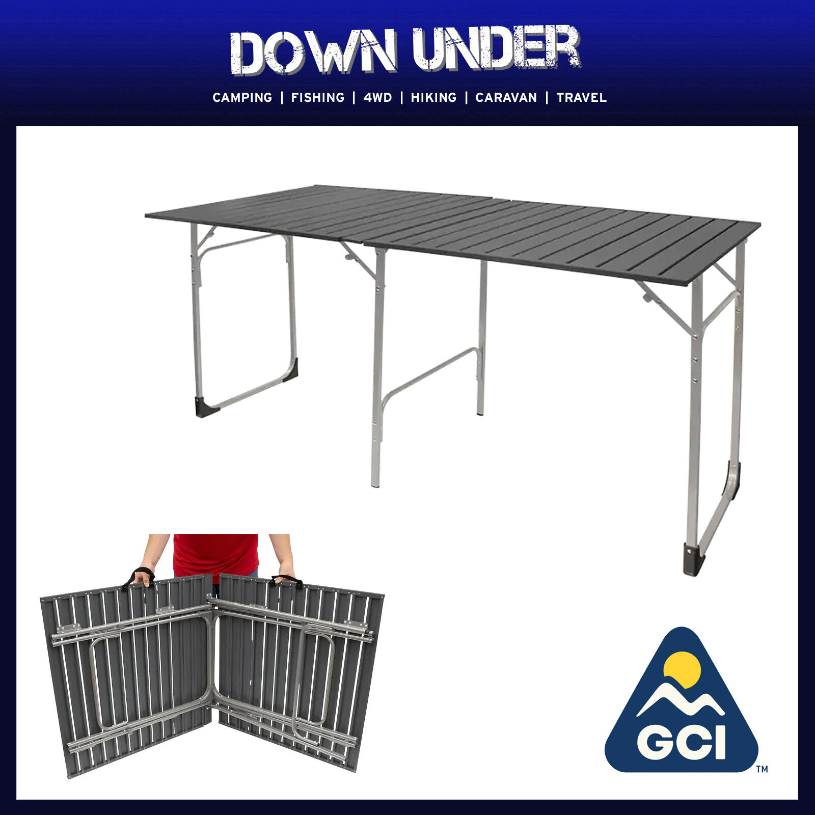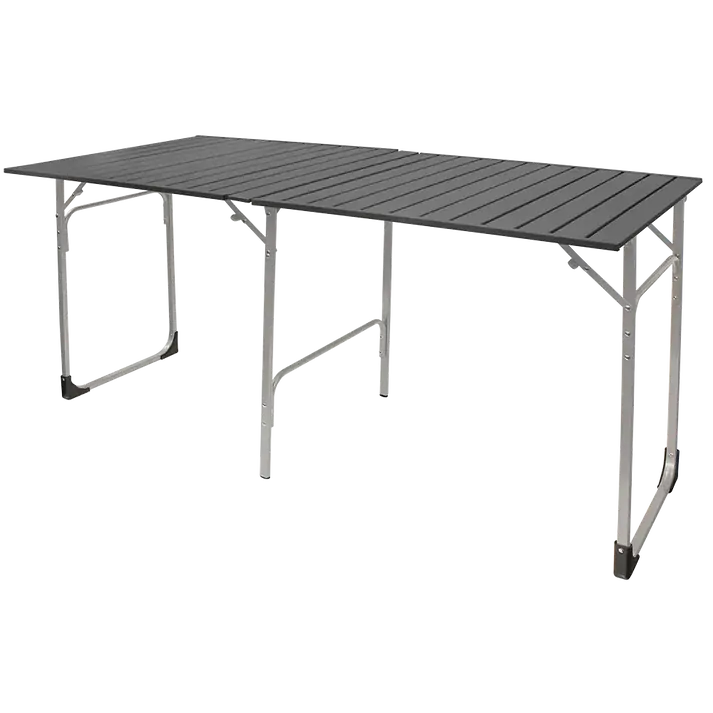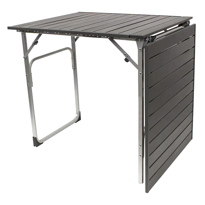The Slim-Fold Table XL is a versatile and convenient folding camping table designed to accommodate 4 to 6 people or serve as a spacious outdoor prep station. Utilising Slim-Fold Technology, it effortlessly unfolds to reveal a heat-resistant aluminium countertop that can support up to approximately 61 kg. The specialised shelving is ideal for organising camp kitchen equipment such as stoves and grills, making it perfect for various outdoor activities like camping, tailgating, and picnics. When not in use, the table folds flat for easy storage and portability, featuring a carry handle. It offers both spacious functionality and compact convenience when folded.
