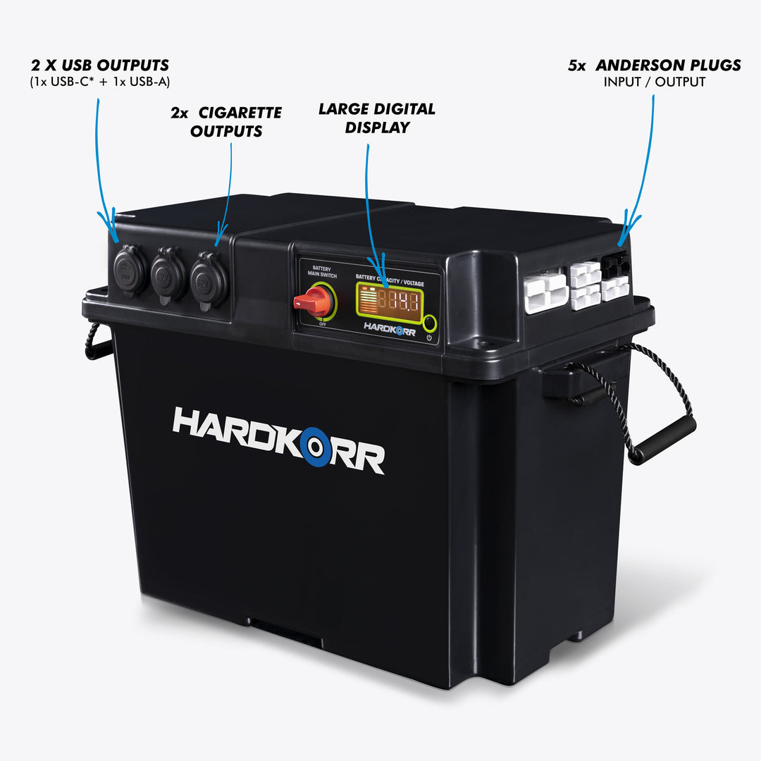 Constructed of durable ABS plastic and meeting the UL 94V-0 standard for flammability of plastic products, this battery box is a high-quality unit that will last for many years. It contains two 12v outlets with 10A fuses, a dual USB (1x USB-C + 1x USB-A) outlet, four 50A Anderson-style outlets that can be used as outputs or inputs, and a 175A Anderson-style outlet which can be used as a jump-starter. Unlike most other models on the market, all Anderson-style ports are recessed into the body to minimise the possibility of damage, and the internal cabling uses heavy-gauge wire and quality connectors.