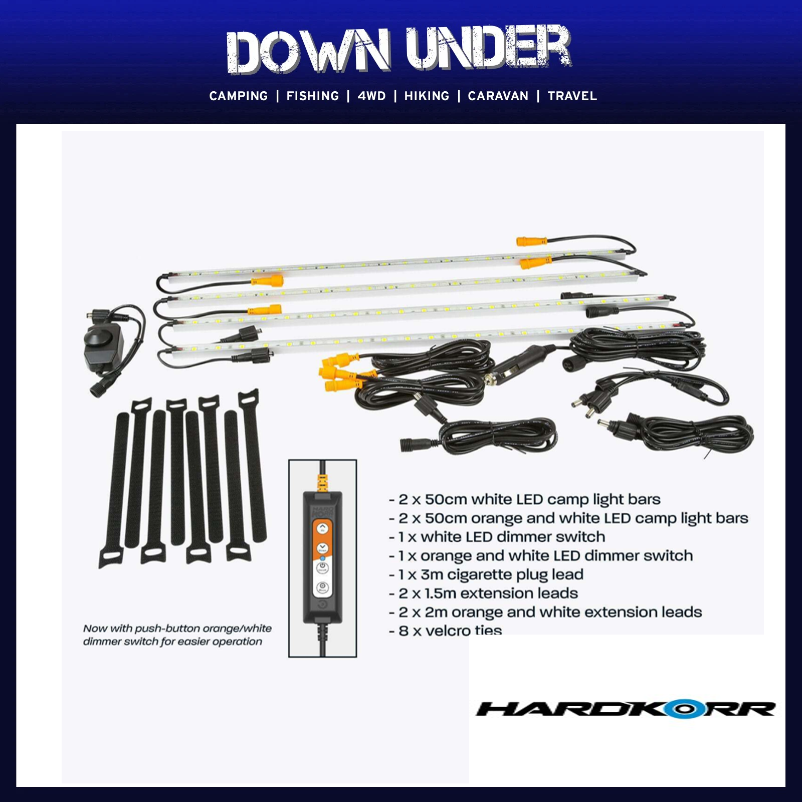 Our Hardkorr Lifestyle 4-bar LED camp light kit is perfect for occasional campers and budget travellers. Representing outstanding value for money, this kit has been manufactured to our meticulous standards and contains all the features you need for a great camping trip. Best of all, two of the included bars come with our famous orange/white light technology!