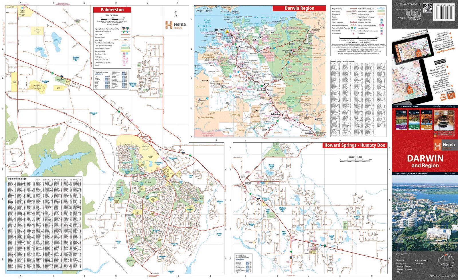 Hema's Darwin and Region Map features Darwin city (1:25,000) and suburbs on one side and maps of Palmerston (1:25,000), Howard Springs to Humpty Doo (1:75:000) and the Darwin region on the reverse.