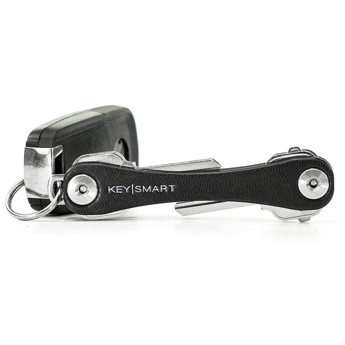 The KeySmart Leather is the most sophisticated way to carry your keys. Soft, synthetic leather wrapped around the aluminium plates provides exceptional hand feel and gives the KeySmart a luxurious appearance. KeySmart Leather includes a loop piece to attach a car fob and can fit up to 10 keys.