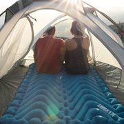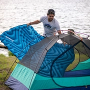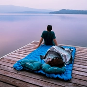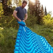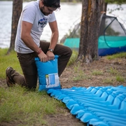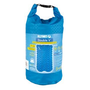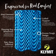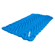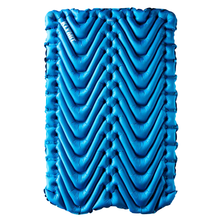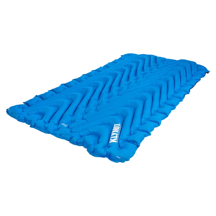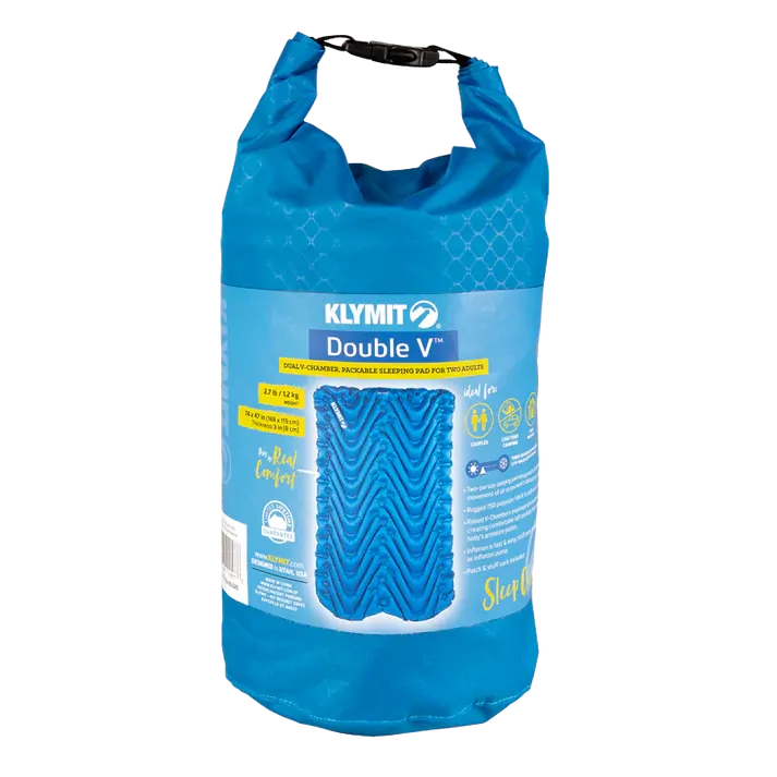 The Klymit Double V™ sleeping pad in blue is designed with side-by-side V-Chambers, providing an ideal solution for partners sharing a sleeping space. Unlike traditional methods of pushing two pads together, the Double V™ offers ample room for two people to sleep comfortably, and its V-Chamber construction minimises air movement between sides, ensuring that one partner won't disturb the other during the night. The pad features Body Mapping Technology with a patented V-shaped design, offering support and comfort regardless of sleeping position. Integrated Side Rails keep users centred on the pad and prevent air movement while tossing and turning. Deep Weld Patterning enhances thermal comfort by creating expansion zones beneath the user, and an Anti-Microbial Laminate inhibits the growth of microorganisms for odour control. The sleeping pad comes with a pump-integrated stuff sack for easy inflation, and its flush flat valves allow for quick deflation. Additionally, the package includes a patch kit for emergency repairs.