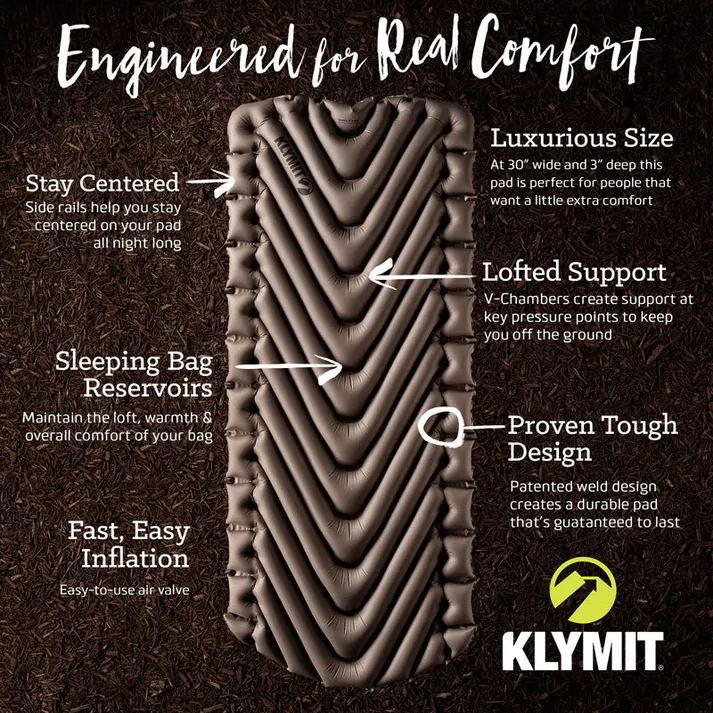 Experience ultimate comfort and space with the Klymit Static V Luxe™ sleeping pad in Stone Grey. Its generous width accommodates even the broadest shoulders, while the patented V-shaped design, enhanced by body mapping technology, ensures support and comfort regardless of your preferred sleeping position. Integrated side rails centre you on the mat, inhibiting air movement during restlessness, while deep weld patterning facilitates optimal loft for your sleeping bag, enhancing thermal performance. The easy-to-use valve allows quick inflation in just 20-30 breaths. Durable 75D polyester construction, 8cm thickness, and a lightweight design make it the perfect choice for those seeking a spacious and comfortable sleep in the great outdoors. Sleep Outside™ with confidence, backed by a two-year warranty from the date of purchase. Packable and weighing only 771g, this sleeping pad epitomises luxurious, portable comfort.