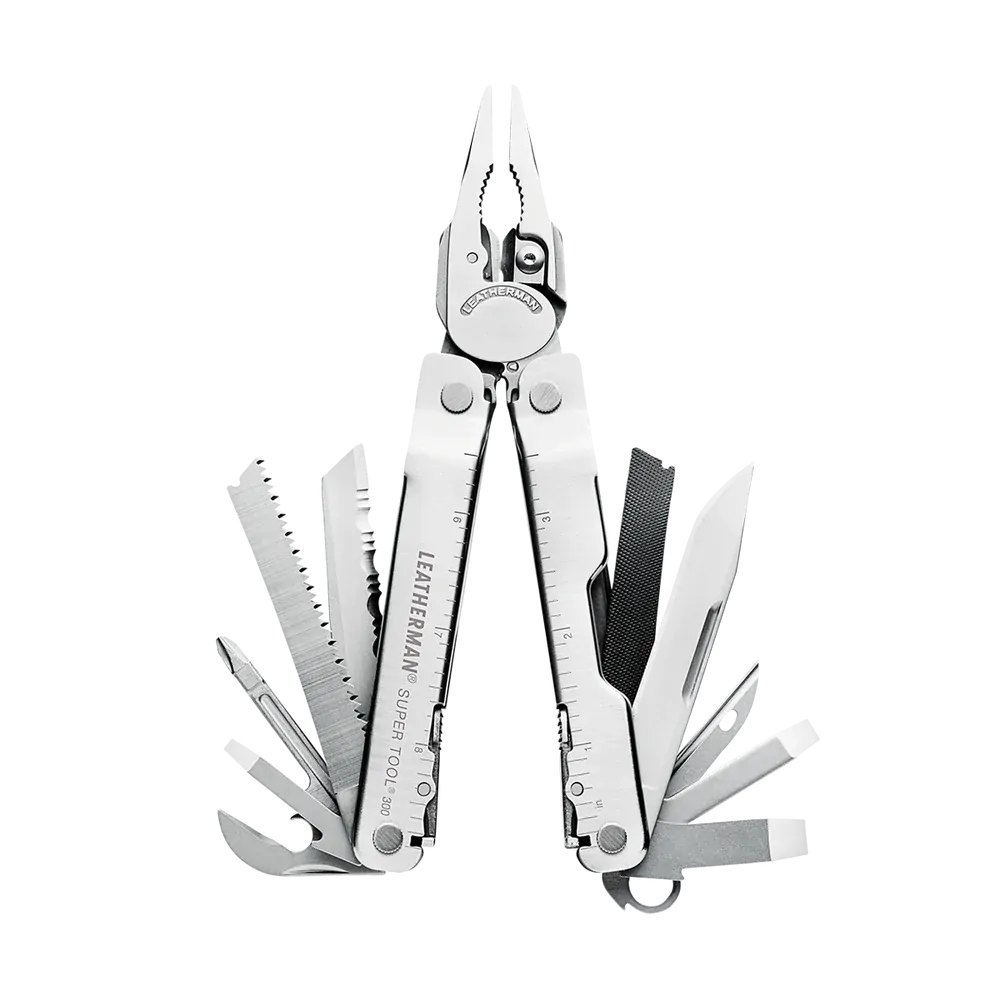 The award-winning, Leatherman Super Tool 300 is the multi-tool for the working man. Larger pliers are the strongest we've ever produced and the sloped-top handle design means you can maneuver them further into tight spaces. When you're working with gloves on, the large side cutouts make it easy to still grab components and rolled handles make for a comfortable grip. Stranded, hard and regular wire cutters all come standard on Super Tool 300, and because they're removable you can repair or re-sharpen on the spot. 19 tools all ready for your toughest jobs. Super Tool 300 is back from vacation and ready to get to work.