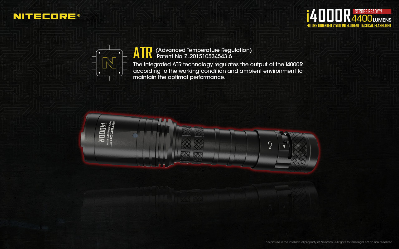 Designed for safety, search and rescue operations, and law enforcement activities, the compact, 6.26-inch i4000R fits nicely in the included NTH20 tactical holster for quick draw. Carry the light with ease by attaching the holster to a duty belt or any standard MOLLE system. With Advanced Temperature Regulation (ATR), an IP68 waterproof rating, and a 1 m impact resistant rating, the NITECORE i4000R is a must-have duty light for daily tasks and high impact tactical operations.