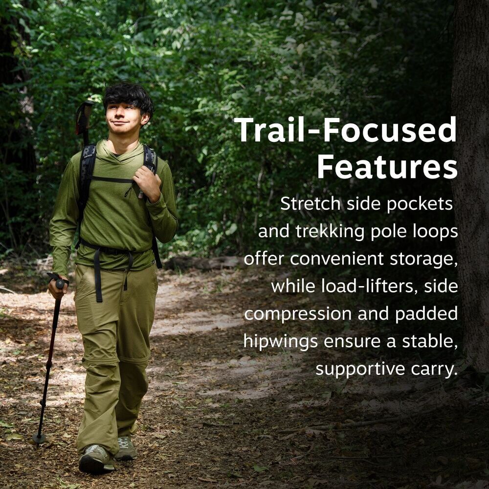 Utilize the front shove-it pocket, large stretch side pockets and trekking pole loops, while load-lifter straps, side compression and padded hipwings ensure a supportive, stable carry.