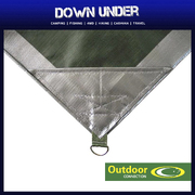 Outdoor Connection tarps are technically superior in their materials and construction. The HDPE (high-density polyethylene) base cloth and LDPE (low-density polyethylene) laminations have had the highest grade UV stabilising agents added to give you a more UV resistant tarp. The 1000 denier base cloth is heavier and stronger than other tarps available. Welded stainless steel ‘D’ rings and reinforced patches are used for the very strong attachment points.