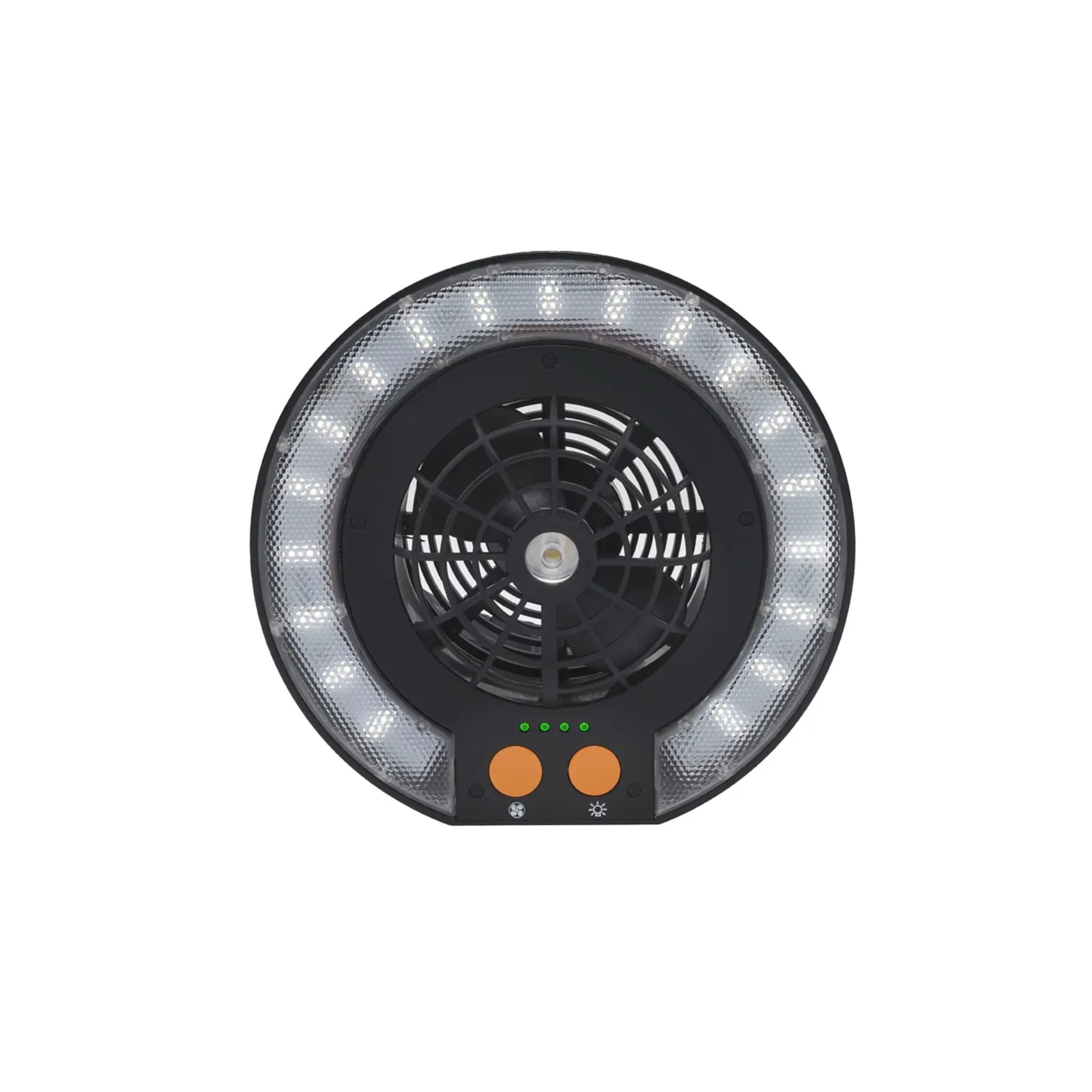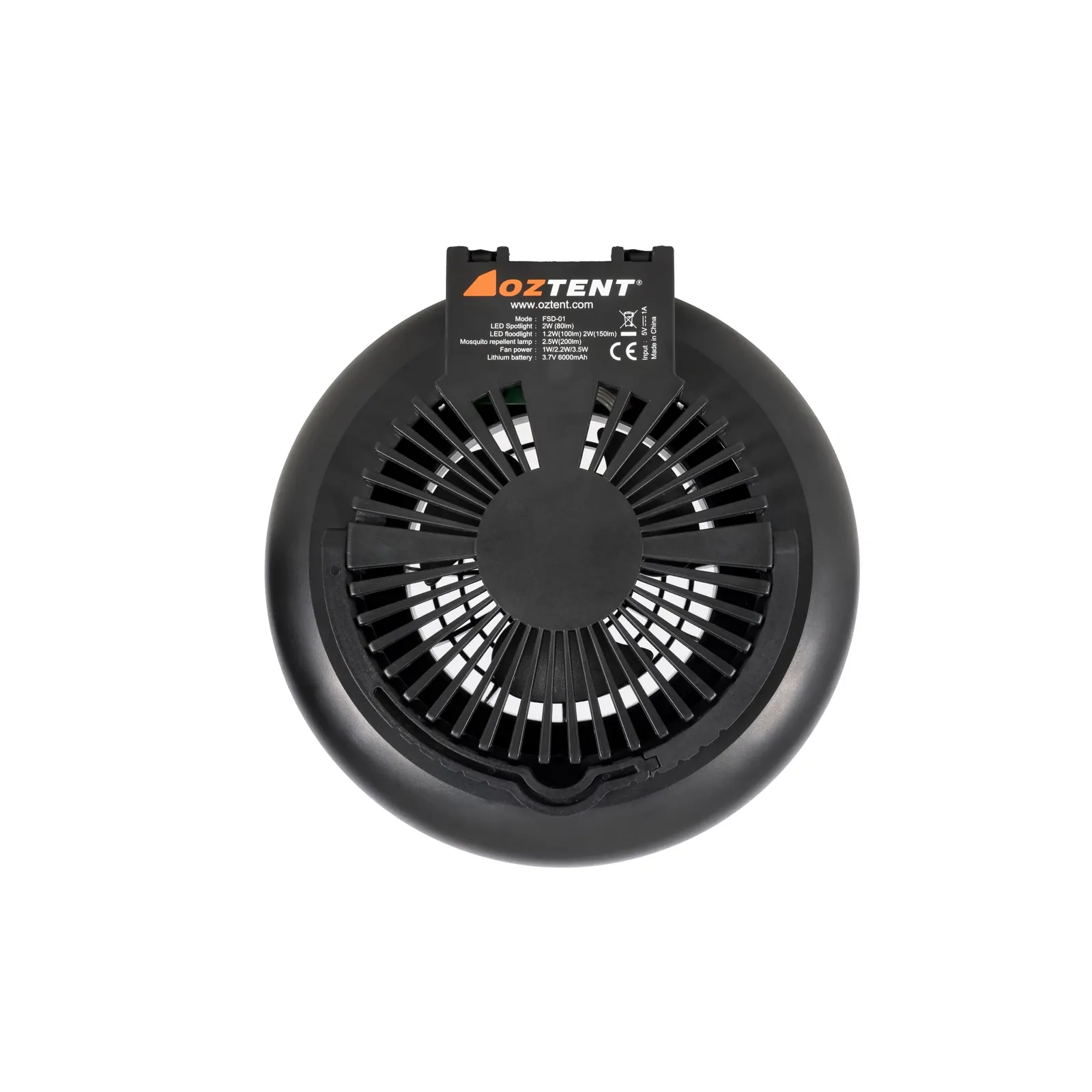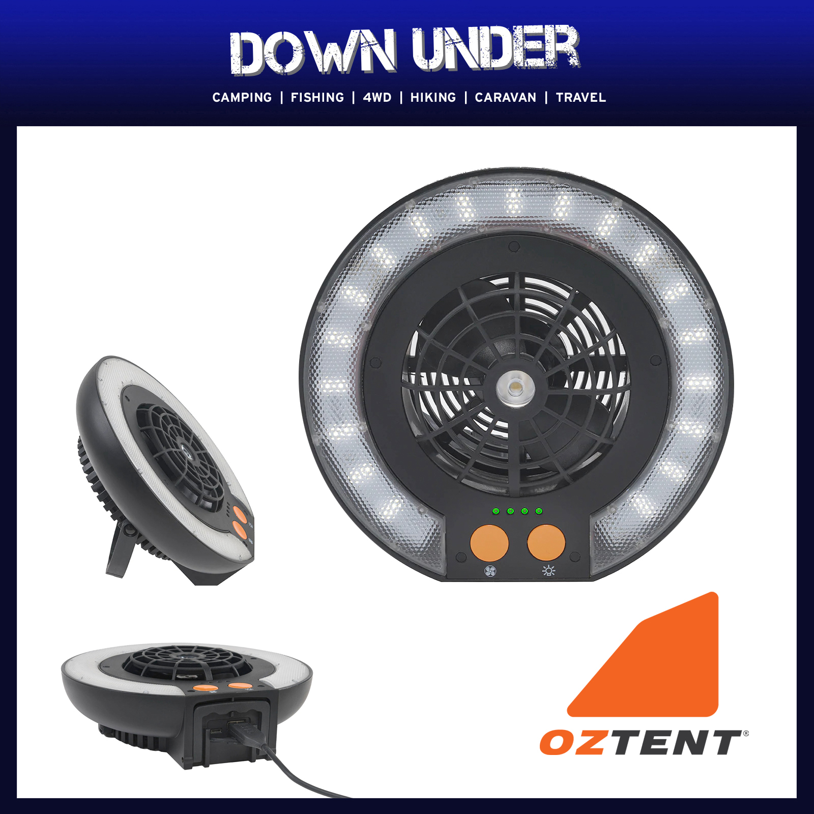 The OZTENT LED Fan Light is a 3-speed fan with multiple lighting functions and USB charge port. Light settings are - spotlight, ring-light lamp and mosquito repellent. Its lightweight design makes it easy to carry, hang or stand. Perfect for keeping your shelter cool and condensation low.