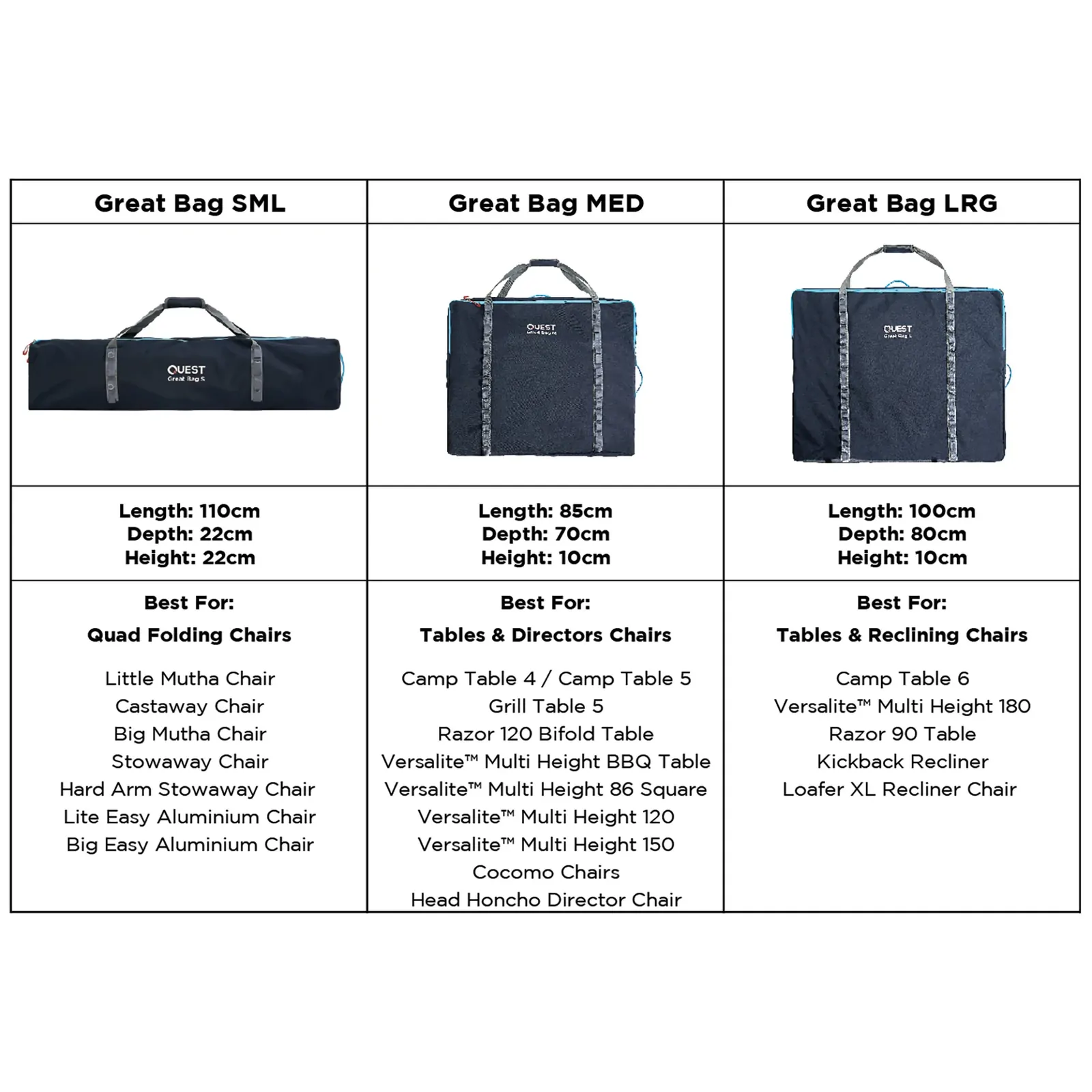 This bag is designed to fit the Quest Camp Table 6 and Versalite 180 Table, as well as other similarly sized trestle tables and chairs, ranging from sun lounges to directors' chairs. There are three sizes available in this range.