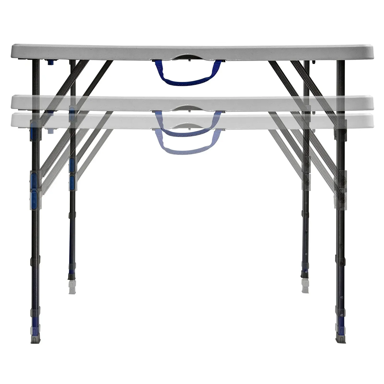 The Versalite™ Multi-Height 86 Square Table is perfect for home, office, outdoor activities, and more! It features a strong powder steel frame, durable blow-moulded tabletop with adjustable height, and an all-weather design. The top is made from UV-protected HD polyethylene, while the rust-resistant steel frame is protected with a powder-coated, weather-resistant finish. The table is adjustable to three heights—56cm, 61cm, and 74cm—and folds in half for easy storage. It comes with a carry handle.
