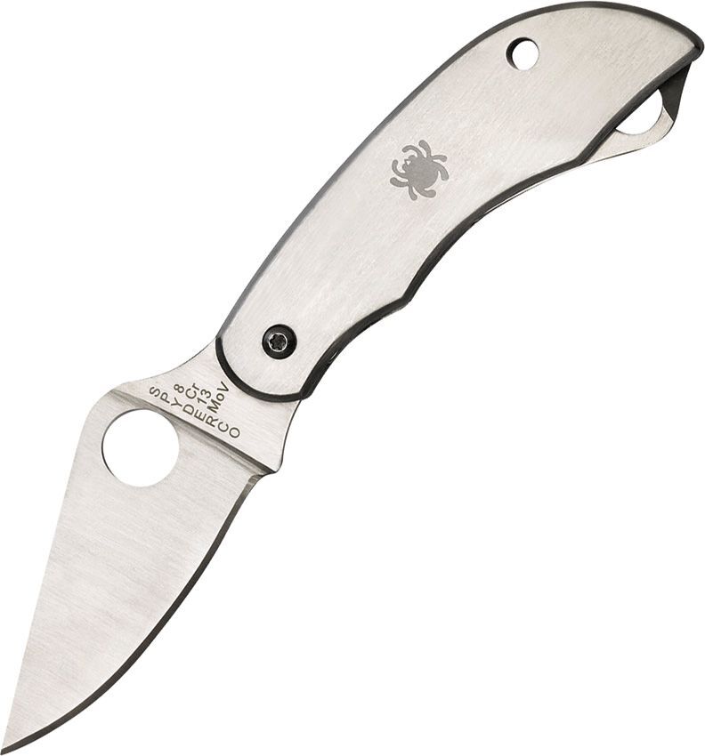 2 5/8" closed non-locking slip-joint folder features 8Cr13MoV stainless standard edge blade with thumb hole, and scissors. Stainless handles with etched Spyder emblem. Stainless pocket clip.