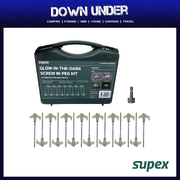 - Introducing the Glow-in-the-Dark Screw-In Peg Kit – the ultimate solution for secure anchoring in hard ground conditions, now with added nighttime visibility. This 16-piece peg kit is purpose-built to provide a reliable hold for guy ropes, awning tie-down kits, tents, and gazebos, ensuring your setup stays firmly in place, even on tough surfaces like gravel, compacted soil, stones, and hard grass. Whether you’re camping, caravanning, or setting up for an outdoor event, these heavy-duty pegs are engineered to perform. What sets this kit apart is its glow-in-the-dark design – a standout feature that enhances safety and convenience. No more tripping hazards or struggling to locate pegs after sunset; the luminous tops make them easy to spot at night, helping prevent accidents and keeping your site organized. Ideal for nighttime setups or early morning pack-downs, this feature is a game changer for those who camp or adventure into the evening. Each peg is crafted for strength and longevity, with a screw-in design that allows for easy installation using a cordless drill or hand tool. The robust threading ensures a deep, stable grip in hard ground, where traditional pegs often fail. The Glow-in-the-Dark Screw-In Peg Kit is a must-have for serious campers and outdoor enthusiasts who value durability, visibility, and peace of mind. Whether you’re anchoring a gazebo in your backyard or braving the bush for a weekend away, trust these pegs to hold firm when it matters most. Add this glow-in-the-dark peg kit to your gear and experience a new level of safety and efficiency in low-light conditions. For camping accessories that work as hard as you do, the Glow-in-the-Dark Screw-In Peg Kit delivers unmatched performance and visibility.