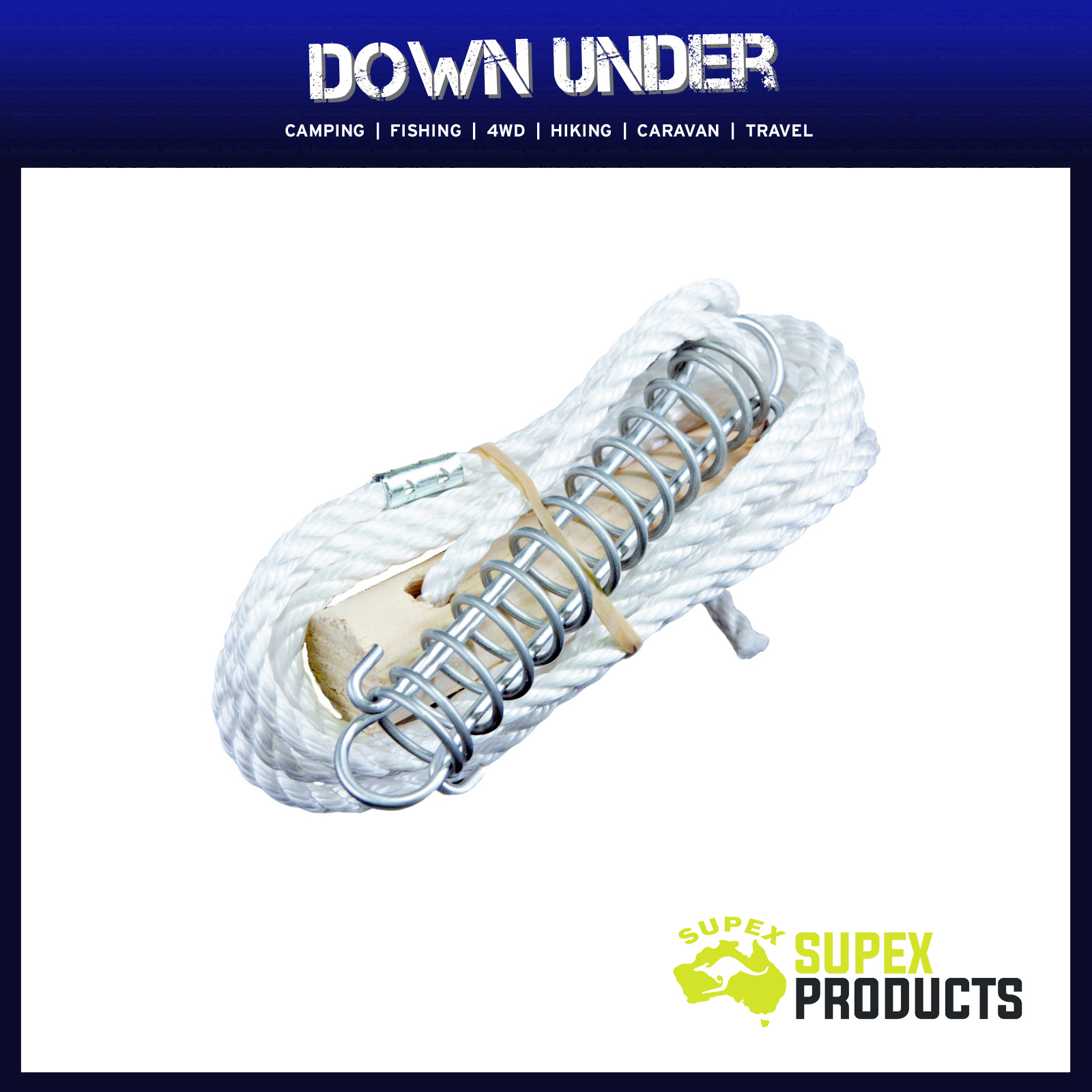 Having the correct tie-down kit is essential if you want to feel certain about the security of your campsite. This rope kit has an optional metal spring, allowing for greater support and security on much larger campsites. The spring absorbs pressure, creating greater tension on the guy rope and keeping material taut for longer.