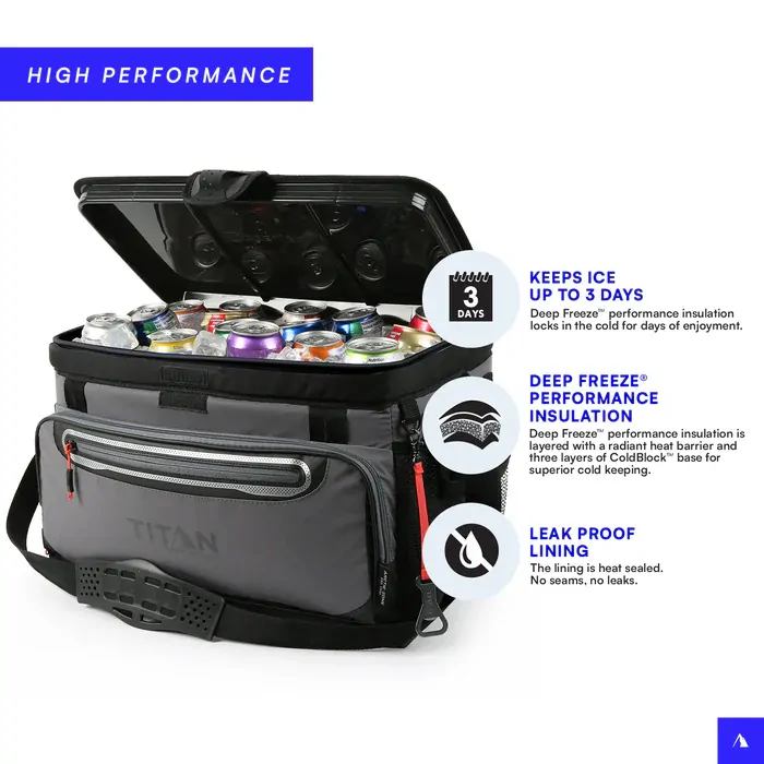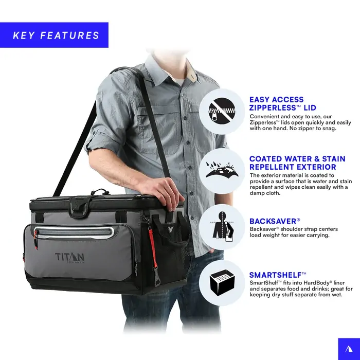 The Titan by Arctic Zone 48 Can Zipperless HardBody® Cooler is built for serious capacity and all-day cooling performance. Featuring a patented Zipperless™ lid for quick access, Deep Freeze™ insulation with a ColdBlock™ base, and a HardBody® liner with SmartShelf™ for organised storage. Durable, leak-proof, and easy to carry with a Backsaver® shoulder strap. Perfect for big adventures and outdoor gatherings.