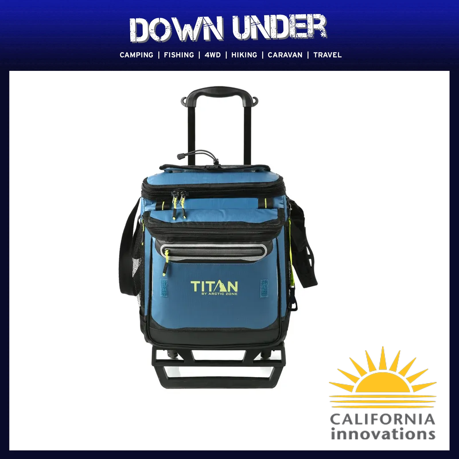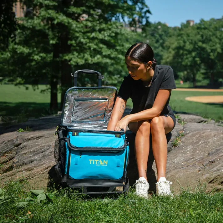 The interior of the cooler features Deep Freeze™ Performance Insulation with radiant heat barrier and triple-layer ColdBlock™ for long-lasting cold. There is also an Ultra Safe® leak-proof, easy clean lining with Microban® to help protect against bacterial odours and stains. Included with the cooler is a detachable all-terrain cart that features an expandable, extra-wide base, oversized wheels, retractable, telescopic hook ‘n’ go handle and can hold up to 45.4 kg. If you want to use the cooler without the cart, the Backsaver® adjustable shoulder strap with anti-slip shoulder pad centres the load weight to help make the cooler easier to carry. Both the cooler and cart collapse for easy storage. *The zipper is not leak-proof.