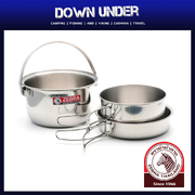 The perfect starter set for your camping or caravanning adventure. Made from food grade sus304 stainless steel, this three piece set includes two pots (one with a folding handle) and a frying pan and comes in a handy carry bag.